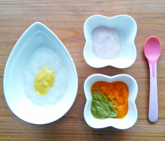 おうちで野菜や果物をすりつぶしたものをたべたり、市販のベビーフードを使ってバリエーションを広げたりし、離乳食を進めていきます。