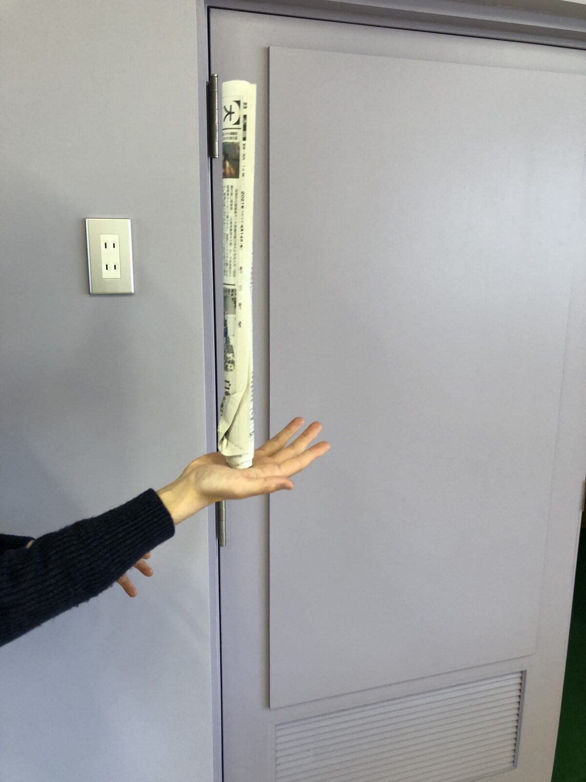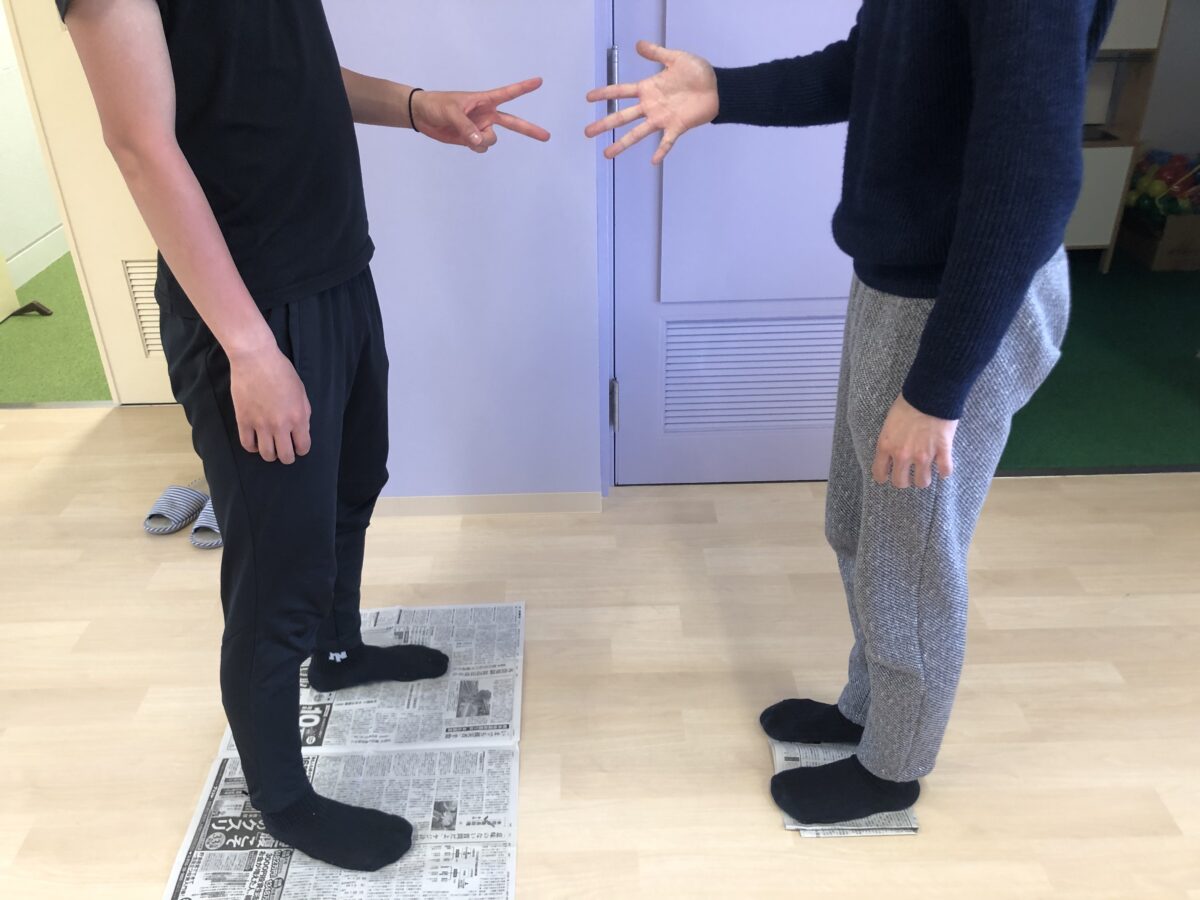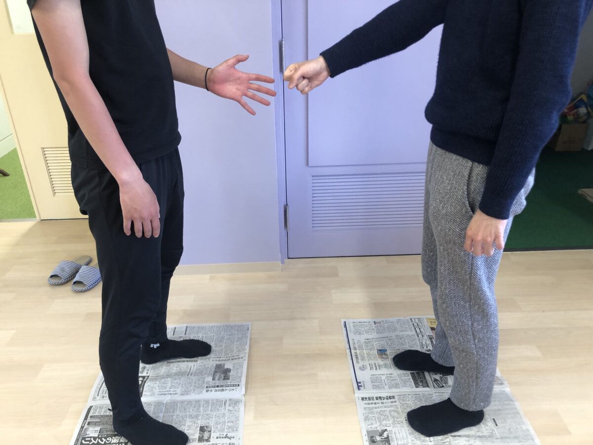 2.丸めた新聞紙を手のひらに乗せます。長くバランスを保った人が勝ちです。