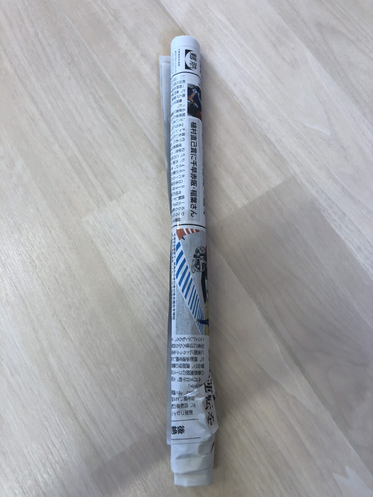 1.新聞紙×じゃんけん使った新聞紙を丸めて、セロハンテープで真ん中を止めます。