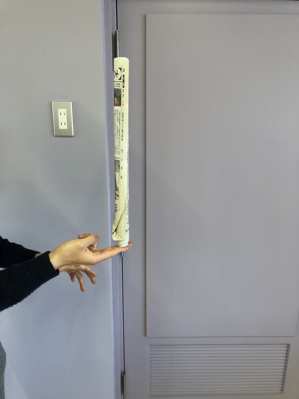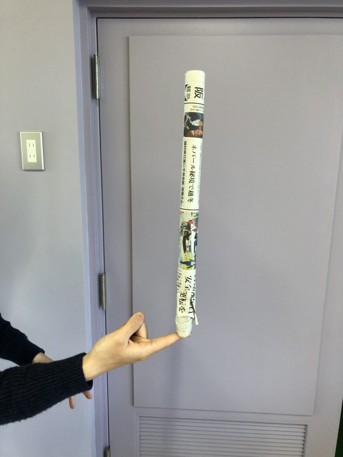 4.丸めた新聞紙を人差し指1本に乗せます。長くバランスを保った人が勝ちです。
